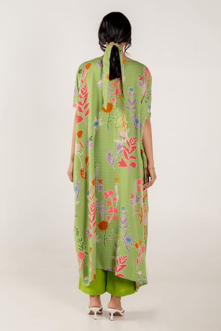 Green kaftan featuring a round neckline and batwing sleeves with rene floral prints. Paired with a straight pant in a matching hue.