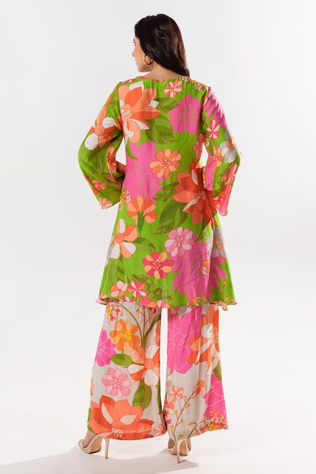 Multicolored floral print kurta featuring a leaf neckline and three-quarter sleeves. Paired with a flared pant in a matching floral print.