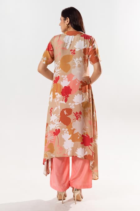 Beige kurta featuring half sleeves, folded V neck, and asymmetric hem with bloom print. Paired with peach pant, creating a cohesive look.