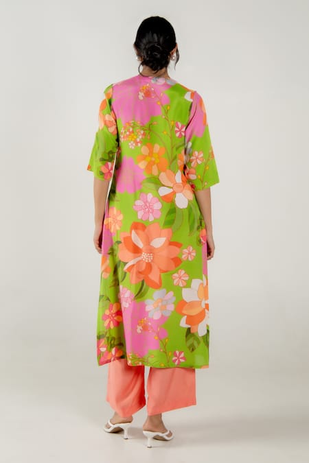 Multicolor kurta featuring a V neckline, half sleeves, and floral print with center pleating. Paired with straight pants in a coordinating color.