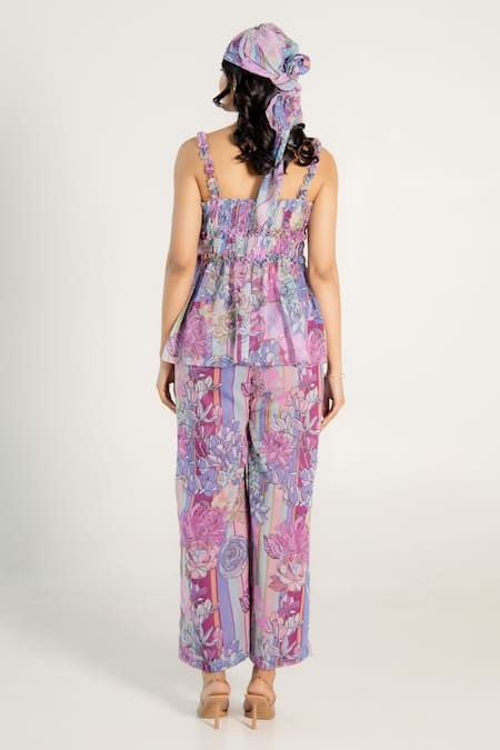 Purple Chiffon Square Neck Pasha Pleated Fay Print Top And Pant Co-ord Set