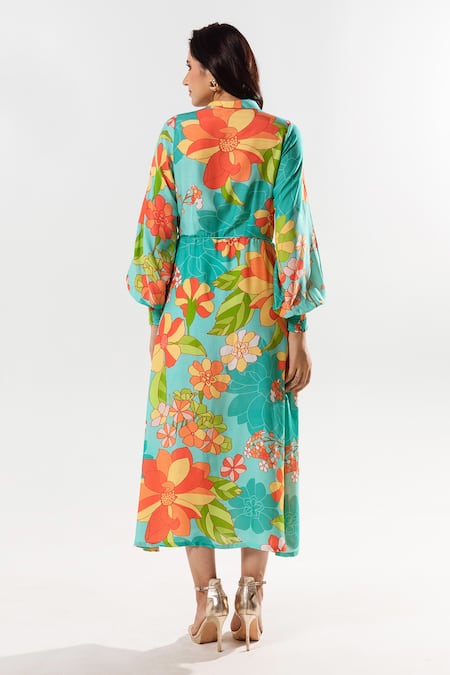 Blue Cotton, Silk Collared Yami Petunia Print Wrap Dress