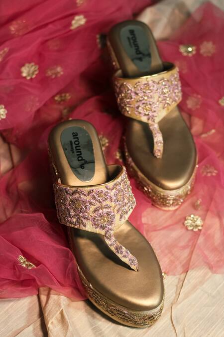 Gold wedges featuring floral and scallop embroidery with a T-strap design