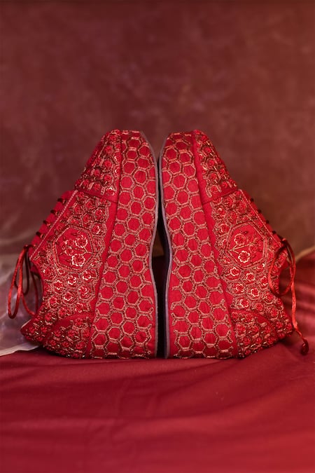 Red sneakers featuring intricate zari, thread, and sequin embroidery in a floral pattern