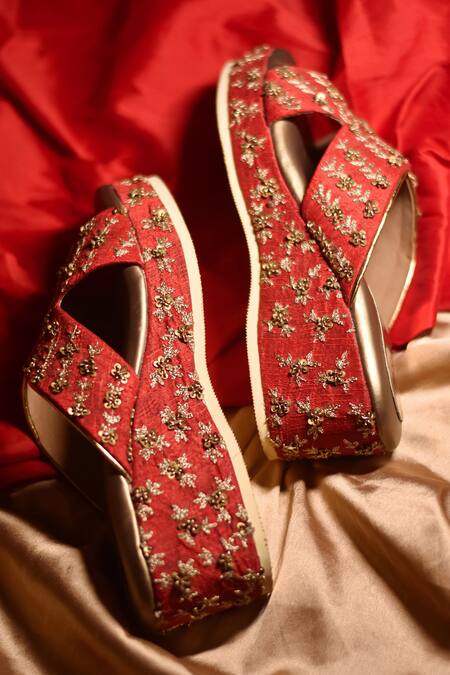 Red wedges featuring floral embroidery adorned with sequins and an open toe design