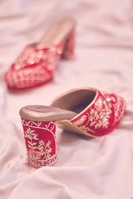 Red block heeled sandals made from velvet featuring floral embroidery with sequins and cutdana
