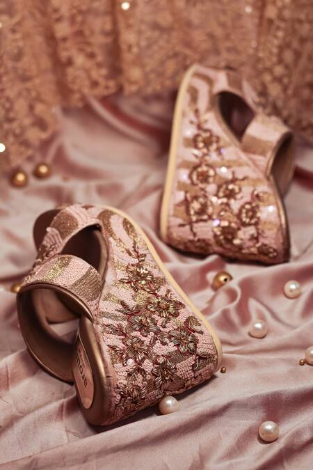 Peach wedges featuring floral embroidery highlighted with sequins