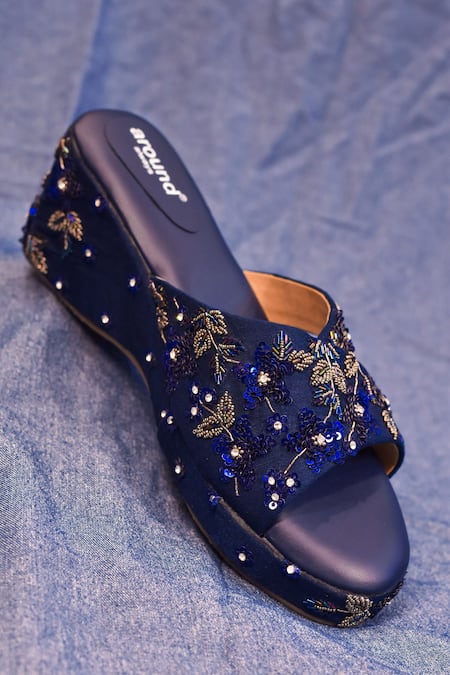 Navy blue wedges featuring intricate sequin, cutdana, and bead embroidery in a floral design with criss-cross straps