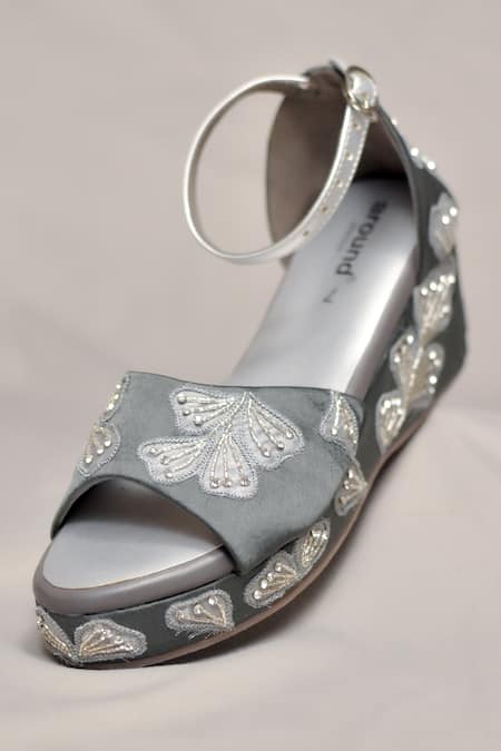 Grey Esme Wedge sandals featuring intricate embroidery and a 3-inch heel height