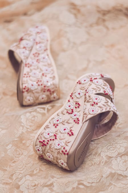 Gold wedges featuring floral embroidery embellished with beads and strappy detailing
