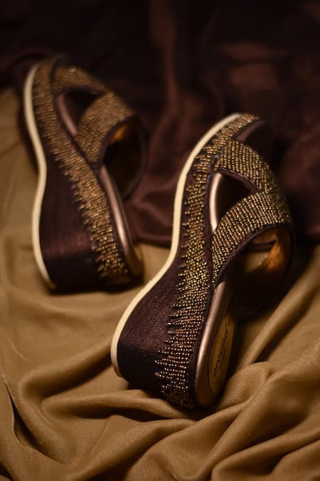 Brown wedges featuring bead embroidery and strappy detailing