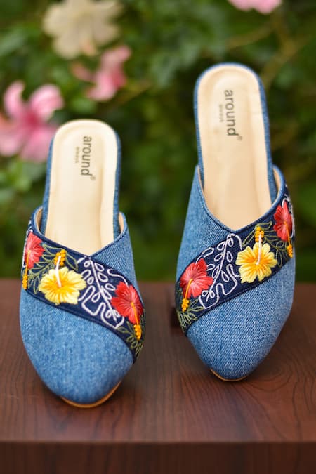 Blue denim mules featuring a pointed toe and a closed shoe pattern