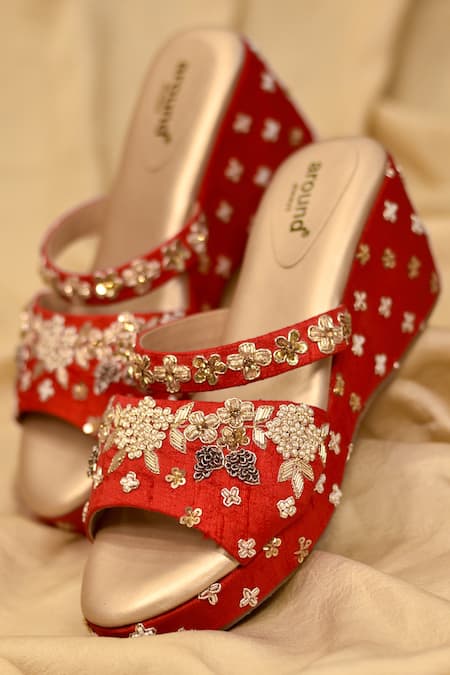 Red Zari, Sequins, Embroidery Jhilmil Zardozi And Threadwork Floral Wedges