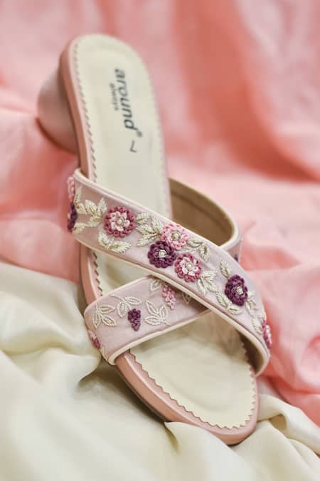 Pink Embroidery, Pearls Kiran Floral Threadwork Crossover Strap Heels