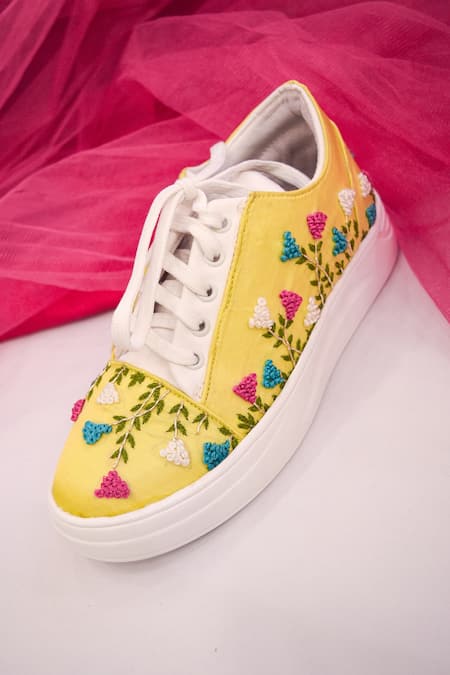 Yellow sneakers featuring multi-color thread embroidery with floral motifs
