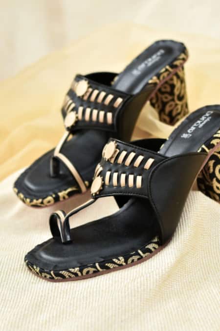 Black Nehal Kolhapuri designer shoes featuring a 3-inch heel and poly silk material