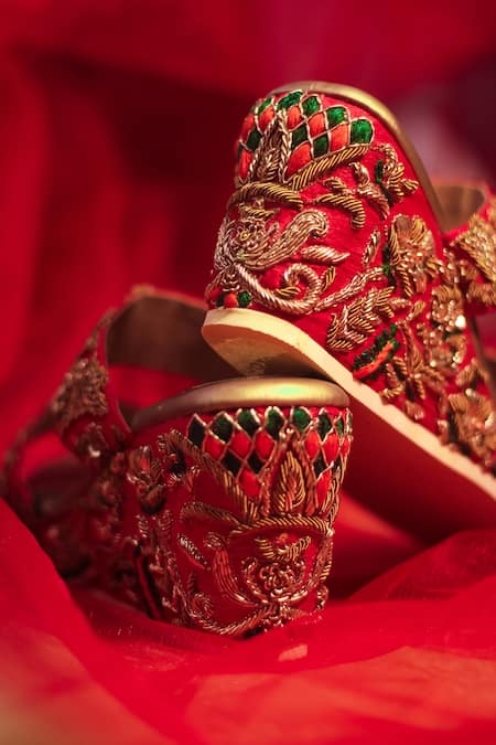 Red wedges featuring floral embroidered motifs and strappy detailing