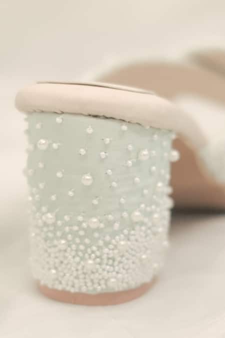 Criss-cross straps with intricate pearl work, Block heels with pearl detailing, Velvet and net combination for a luxe feel
