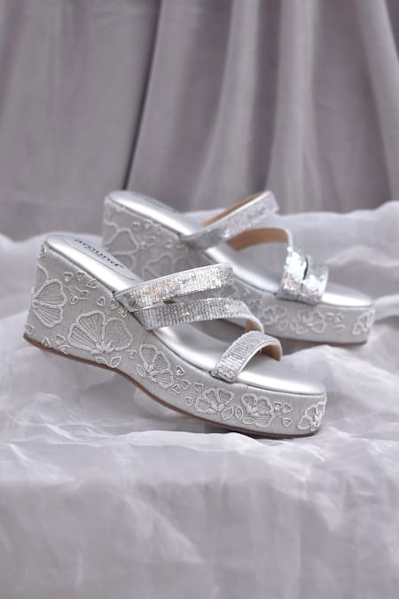 Silver wedges featuring floral embroidery and two embellished straps