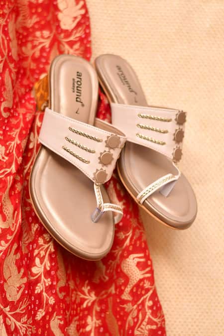Ivory Kolhapuri-inspired heels featuring golden accents and a brocade block heel.