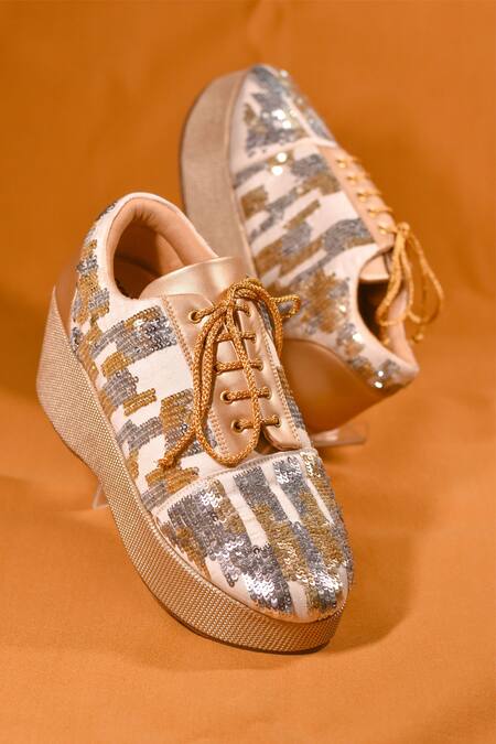 Gold sneakers featuring sequin and thread embroidery in a geometric pattern