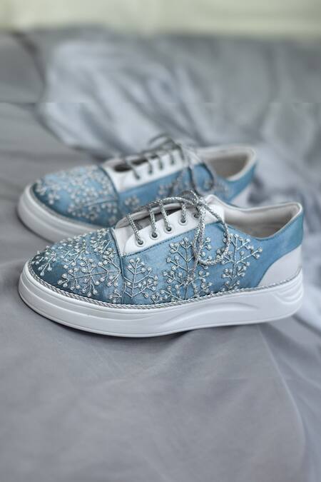 Blue sneakers featuring floral bead embroidery and lace tie-up detailing