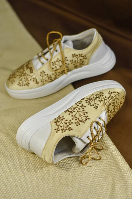 Gold sneakers featuring floral bead embroidery and lace tie-up detailing