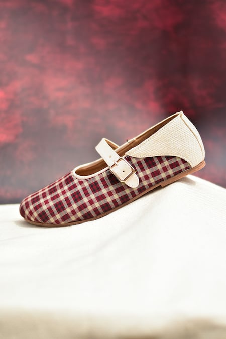 Red poly silk Mary Janes featuring a belt buckle closure.