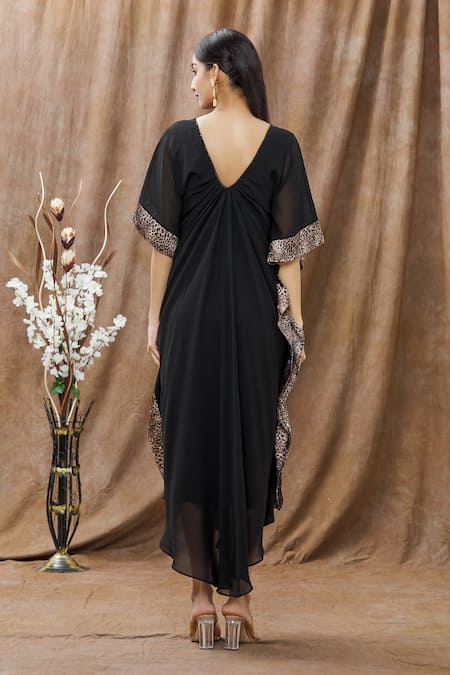 Black Georgette Animal Print And Beads V Neck Asymmetric Kaftan Dress