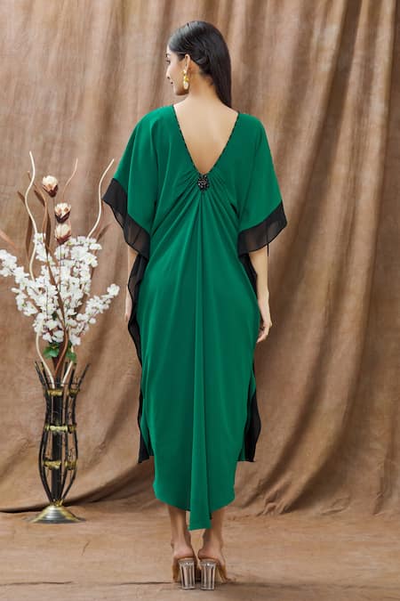 Green Georgette Beads V Neck Embellished Neckline Kaftan Dress