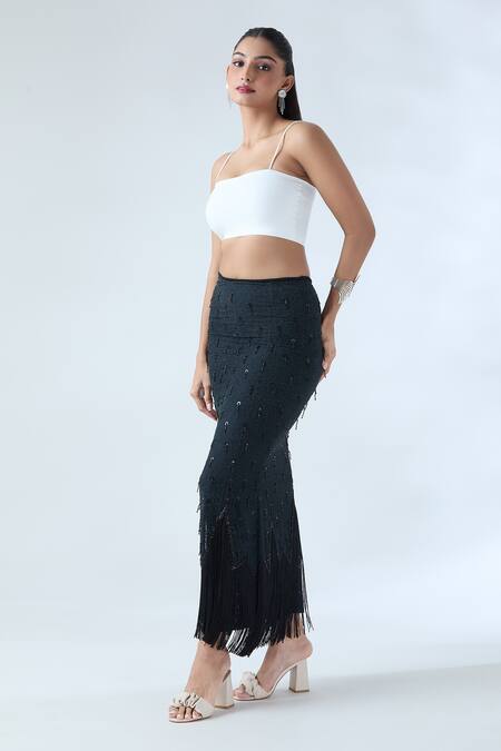 Black pencil skirt featuring circular metal and sequins embroidery with asymmetric fringes detailing