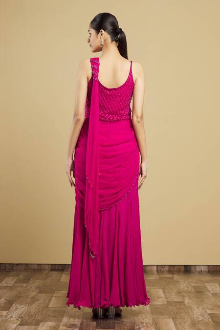 Pink pre-draped saree highlighted with embellishments. Comes with cami blouse.