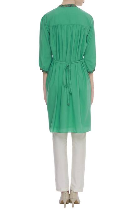 Green kurta with front pintuck yoke & braided trim detail.