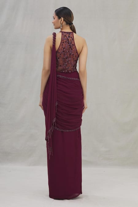 Purple plum pre-draped ruffle saree with embellished border and pallu. Comes with halter neck blouse