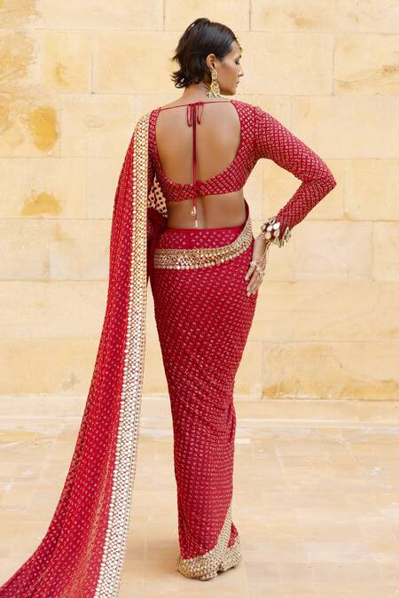Red georgette saree featuring an all-over floral pattern with hand-embroidered mirror, bead, and cut dana work. Paired with an embroidered blouse showcasing tear drop tasseled sleeve borders.