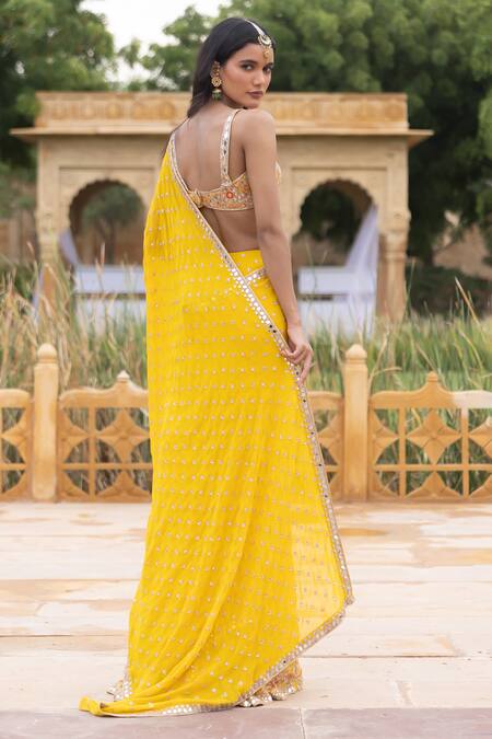 Yellow georgette pre-draped saree featuring an all-over butti pattern with tonal sequin, cut dana, bead hand embroidery, and mirror work highlights on the layered border. Paired with a sweetheart neck floral thread embroidered blouse.