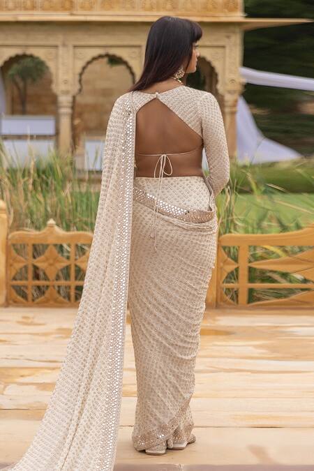 Buy_Arpita Mehta_Ivory Georgette Mirrors, Beads, Cut Emboidered Pre-draped Saree And Blouse Set_Online_at_Aza_Fashions