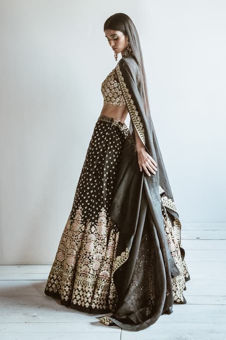 Black lehenga featuring floral zari thread, sequin, and mirror embroidery with an attached cancan. Paired with a padded scoop neck blouse and semi-sheer embroidered dupatta.