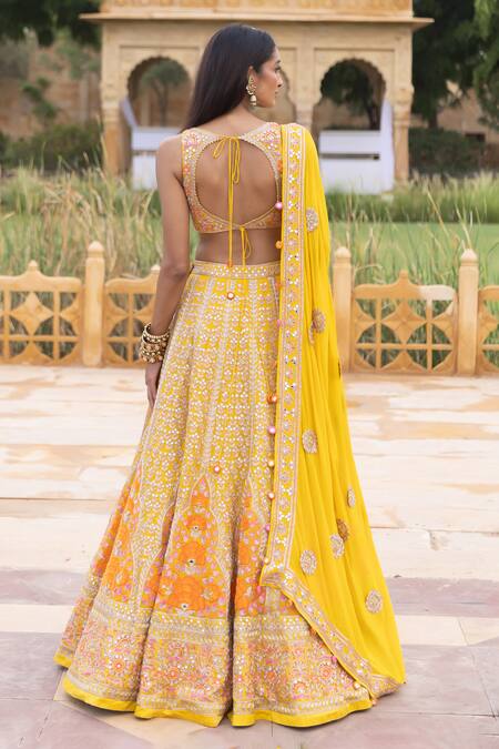 Yellow lehenga featuring an all-over vintage floral jaal pattern with contrast thread, mirror, bead, sequin, and cut dana hand embroidery. Paired with an embroidered leaf neck blouse and floral applique work dupatta.