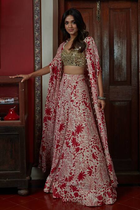 Red embroidered blouse with sweetheart neckline and three-quarter cape. Paired with a floral sharara featuring tassel details.