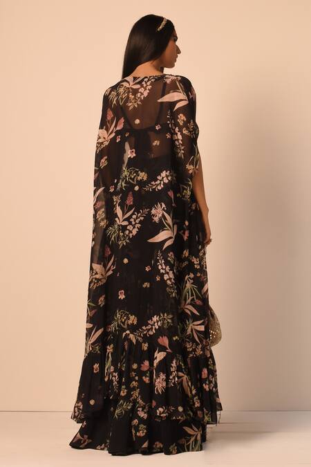Black floral printed gharara set featuring a sleeveless blouse and a cape with floral prints. The blouse is made from net fabric, while the gharara and cape are crafted from georgette.
