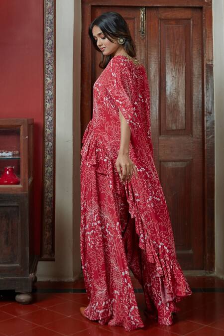 Red Georgette Garden Print Cape And Pant Set