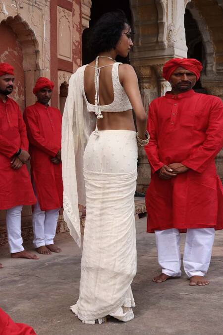 Ivory pre-draped saree featuring floral hand embroidered buttis. Paired with a padded blouse adorned with pearl and cutdana hand embroidery.