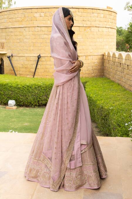 Pink Net, Organza Mirrors, Zari, Cut Work And Thread Bridal Lehenga Set