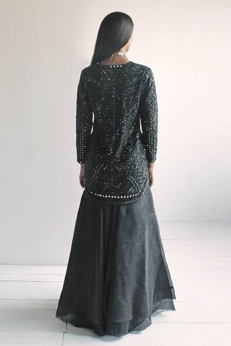 Black jacket featuring mirror embroidery and a plunge V neckline. Paired with a matching sharara, both designed for a relaxed fit.