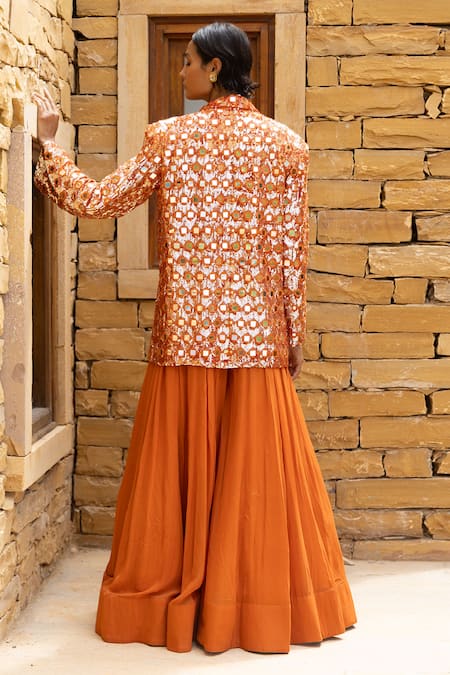 Toasted orange jacket featuring notched lapel collar with hand embroidery, mirror, and sequin work. Paired with a gathered flared sharara for a fusion style look.