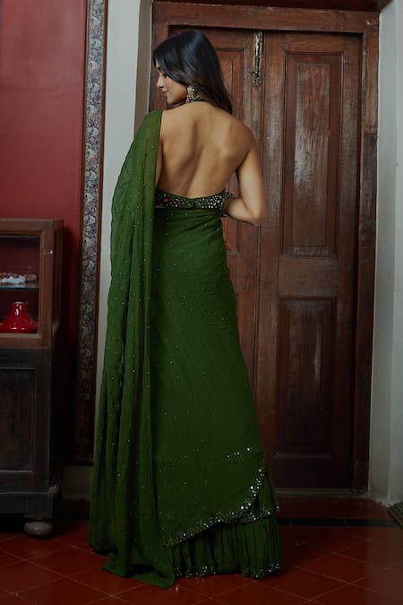 Green pre-draped tiered saree featuring tonal embroidery and mirror work on the border. Accompanied by a mirror embroidered halter neck blouse with a backless design.