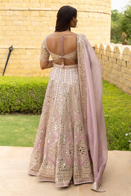 Baby orchid lehenga featuring all-over floral Mughal pattern with contrast thread, mirror, zari & cut dana hand embroidery. Paired with a sweetheart neck blouse and embroidered bordered organza dupatta.