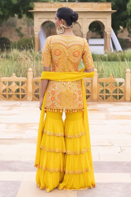 Yellow jacket featuring deep V neck and half sleeves with intricate hand embroidery. Paired with a pleated multi-layered sharara and a coordinating dupatta.