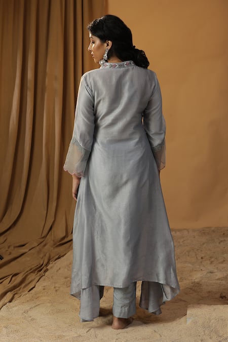 Ice blue chanderi kurta featuring a V-neck, full sleeves, and scallop hem details. Paired with coordinating solid straight pant, this set showcases abstract hand paint motifs with pearls and cutdana embroidery.